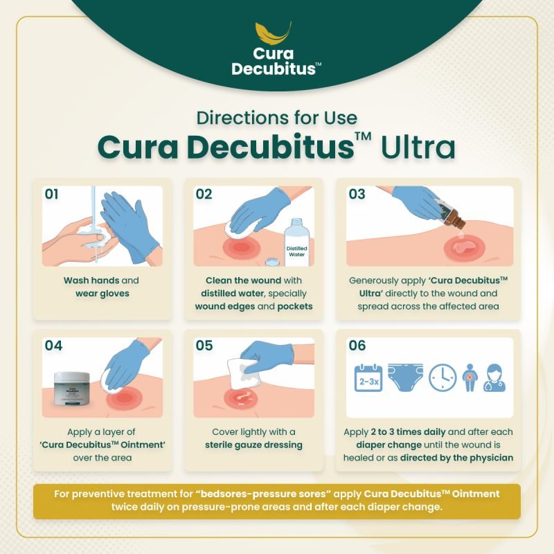 Cura Decubitus™ is a topical wound-care range developed to support the treatment and prevention of bedsores, pressure ulcers, slow-healing wounds, and non-healing external ulcers. It is available as Cura Decubitus™ Ointment and Cura Decubitus™ Ultra, which are used together for better results.